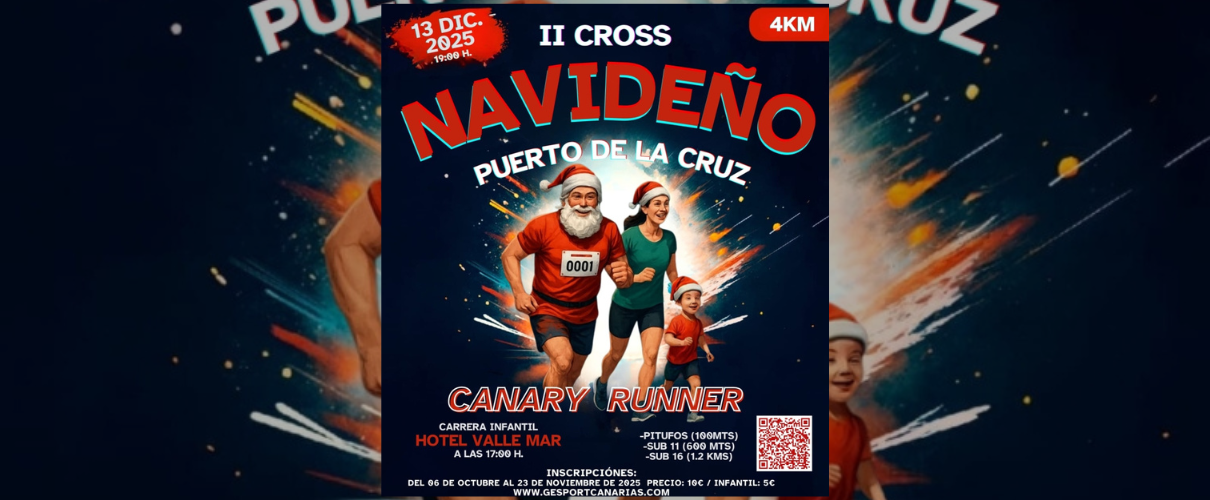 Partecipa alla II Cross di natale il 13 dicembre a Puerto de la Cruz. Un evento sportivo con lo spirito del Natale. Un percorso pensato per tutte le età e i livelli, dove la buona atmosfera e la magia di Puerto de la Cruz saranno i protagonisti. Non te la puoi perdere!
