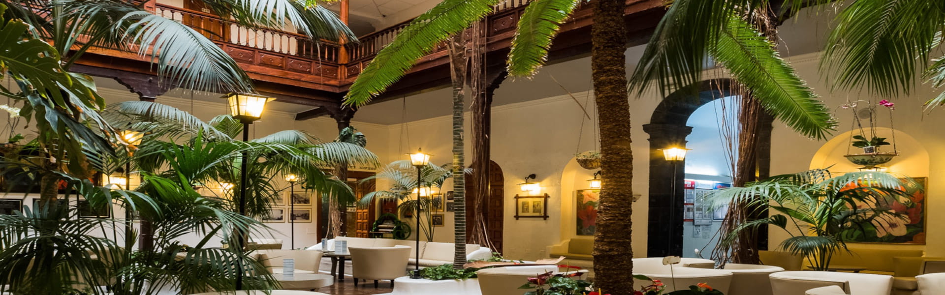 Attorno al cortile interno in stile canario, dove crescono palme e piante, si erge una balaustra intagliata in legno pregiato che si snoda lungo i tre piani dell’edificio, ricoperta da piante rampicanti tropicali che si aggrappano a secolari colonne in tea (legno di pino canario), offrendo ai visitatori un'autentica oasi di pace.