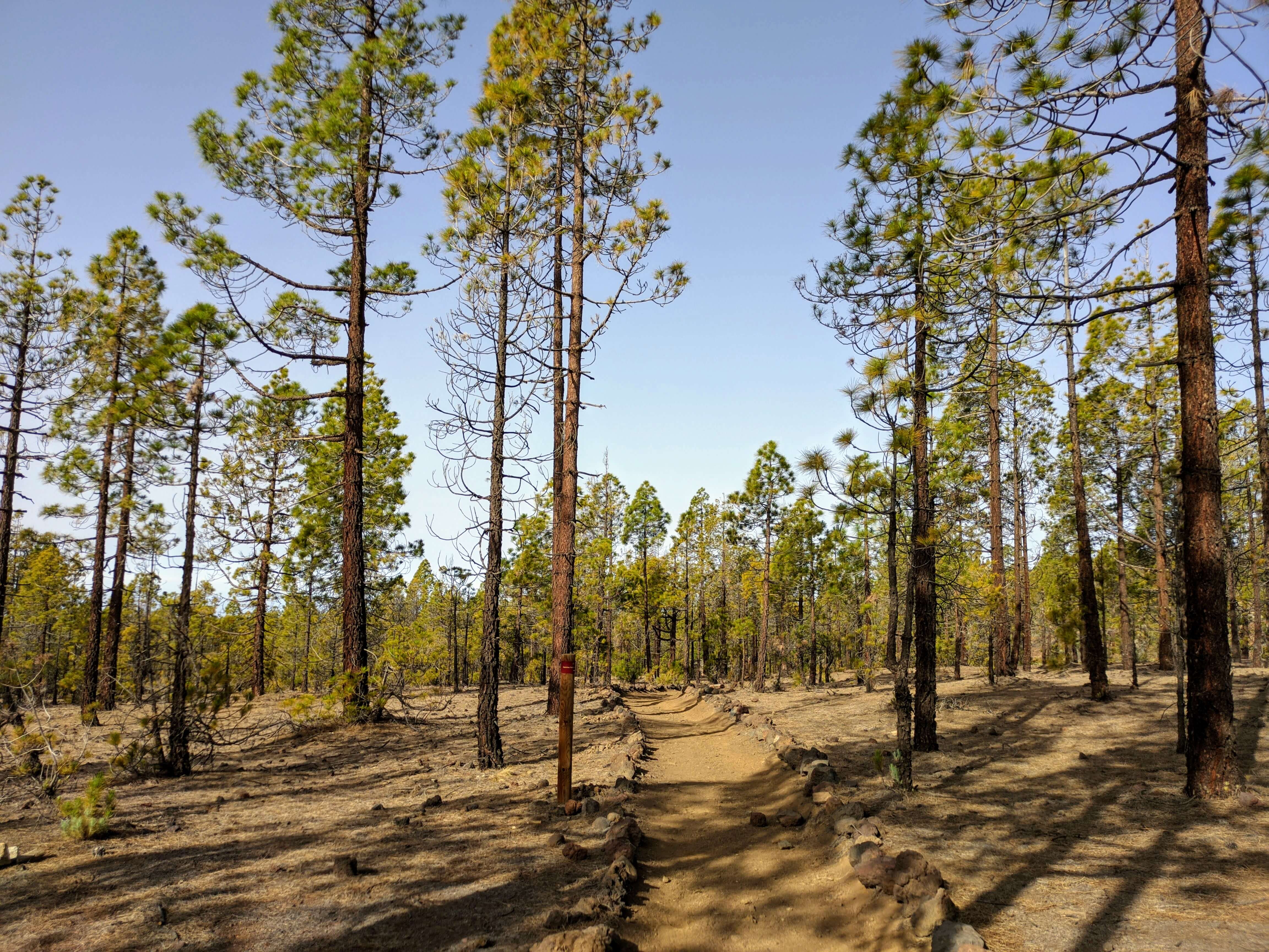 - Km 16,9 Si raggiunge il sentiero per Madre del Agua, un punto che si è superato durante la salita. Ora continuate lungo la pista, sulla destra. Segnaliamo che è possibile tornare lungo il GR-131, ma continuiamo lungo la pista per un buon tratto di corsa e anche per passare e vedere i pini più grandi delle Canarie.